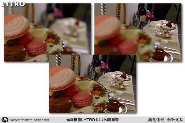 ▲一般照相時如果鏡頭有很靠近近物品時,如果對焦點是在近物,那麼遠端物體通常容易模糊,反者異同;上方兩張圖一個焦點是在近物馬卡龍上,另一張焦點是在遠端的紅酒瓶上,但是透過"調整"選單裡的"景深"功能,將景深範圍擴大就可以將遠景及近景都清楚呈現,而Lytro Desktop可以輸出的最大jpg檔案是2450*1634。