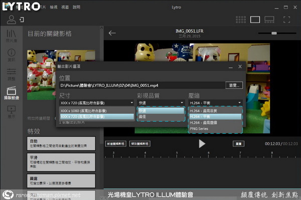 ▲Lytro Desktop的"拍攝動畫"特效可以輸出影片的選項,最大輸出尺寸為1080*720的mp4檔。