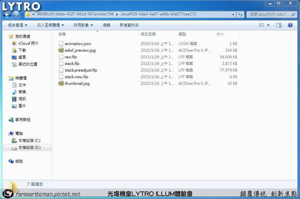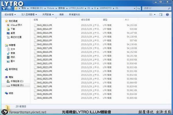 ▲這是從LYTRO ILLUM光場相機記憶卡插入電腦後顯示的檔案情形,每張用光場記錄的檔案都有54MB大小,跟一般相機或手機的3-5MB容量大了不少;雖然光場相機可以事後任意調整焦點,甚至在電腦上做許多的修改,但也是因為它檔案裡提供了太多的資訊,所以檔案都很大,以往照相時可能快門隨便拍,連拍也照樣按下去,但是使用光場相機可能就要稍微節制一點點,當然也要看使用者的需求拉,一般使用者隨便按快門,事後可能會發現這些資料匣會很佔記憶卡或電腦硬碟空間的。