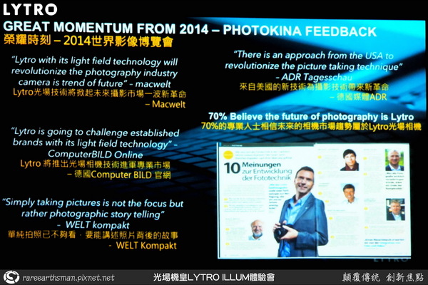 ▲位於德國科隆的2014 Photokina世界影像博覽會,LYTRO相機獲得了滿多的獎項,這個德國相機重鎮所舉辦的展覽,在參展結束之後訪問了眾多的相機專業人士參觀的感覺或是最亮眼的產品,約70%的人都回答LYTRO光場相機是這次展覽最新最耀眼以及最新的科技,也是業界首見可以先拍照後對焦的相機,顯見LYTRO光場相機受到了極大的好評。