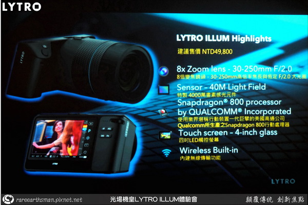 ▲LYTRO ILLUM光場相機,規格上這顆鏡頭是日本製造的是8倍變焦鏡頭、30-250mm F/2.0的大光圈、Sensor使用40M Light Field等同於4000萬畫素感光元件、高通Snapdragon 800處理器、4吋LED觸控螢幕加上無線傳輸的功能;代理商的建議售價是新台幣49,800元。