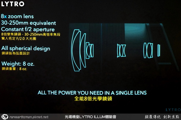 ▲LYTRO ILLUM光場相機這顆鏡頭是顆全能的8倍光學鏡頭,30-250mm高倍率焦段,F/2.0大光圈,鏡面皆是弧面設計,重量只有8oz;光場相機在攜帶性、方便性與技術性都很容易的使用。
