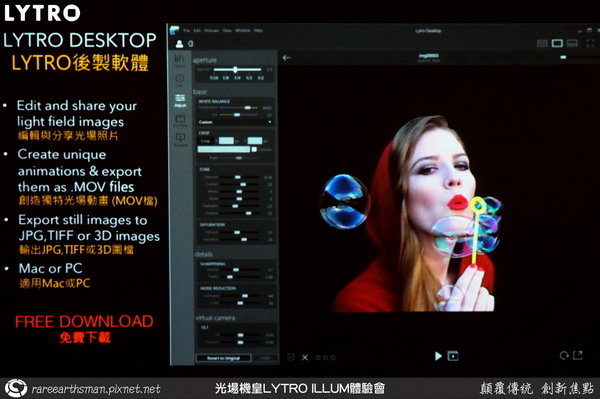 ▲LYTRO在後製的軟體支援也非常的豐富,LYTRO Desktop這套軟體可以在拍照完做一些後製與分享的功能,功能與介面與現有市面上常件的影像編輯軟體相似,而且特別的是可以錄製獨特的光場動畫;這套軟體也可以輸出圖檔,包括jpg、tiff與3D圖檔,Mac與Windows都可以使用,而且是完全免費的。