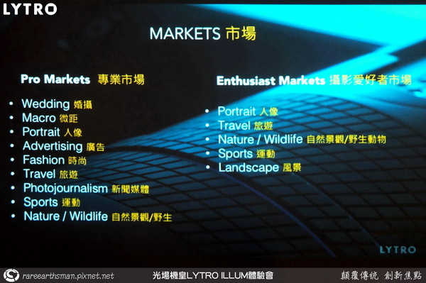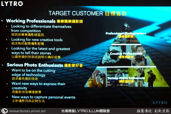▲雖然就操作上不分年齡與性別都可以使用這台相機,但是因為操作習慣與屬性的關係,甚至於價格部分,LYTRO ILLUM光場相機的目標客群主要是瞄準創意攝影師這個客群,在攝影的商業市場上,想透過光場產生特殊或者是動畫的故事效果,這類傳統型相機所做不到的攝影方式,想創新與習慣新技術的攝影師,透過技術上的突破,來創造出新的影像記錄。