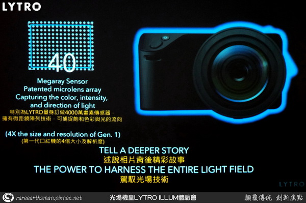 ▲LYTRO ILLUM光場相機40M Light Field的Sensor也是LYTRO的專利,也是專門為LYTRO量身訂做的尺寸,具有微距陣列的技術,可以捕捉到非常飽和的色彩與光線的流向;ILLUM的解析度是第一代口紅機的4倍大,拍攝出來的影像進步了非常多。