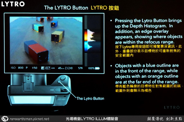 ▲LYTRO ILLUM光場相機的主要設定是先透過變焦環來調整焦段,然後螢幕顯示右側會出現藍色到橘紅色的色階顯示對焦的部分,雖然代理商說可以先拍照再變化焦點,但這個前提是對焦的位置也是正確的狀況,也就是說如果拍照的對焦點沒調好,事後也非常有可能對不到你想要清楚的點,所以透過對焦環的調整儘量將右側的主要波形位在藍橘的色階區段,同時及時畫面會在近距離物體邊緣出現藍色顯示,遠端物體出現橘紅色顯示,這樣的照片比較會成功,如果螢幕顯示全都是藍色或全都是紅色,那麼它變焦的效果就不好了,可能是後再怎麼點,圖片都沒有變化的效果。