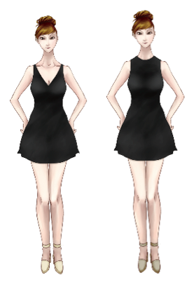 ▲ 圖說:(左)NG 肩帶較細的V領領口,因為露出較多的胸前肌膚,造成脖子視覺上的縱向延伸,加重長脖子的問題。 (右)OK 同樣的黑洋裝改為領口較小的圓領,阻斷視覺延伸,成功改善長脖子的身形困擾。