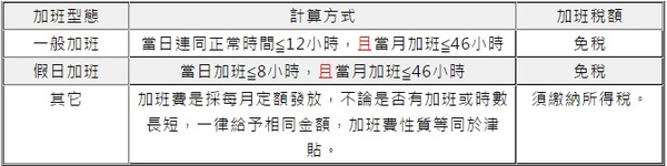 而在上述加班時數限度裡領到的加班費,可免納所得。以每日正常公司八小時來計算,意即平日每日加班時數在四小時內可免稅。