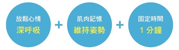 1分鐘完美曲線操的重點是「維持姿勢」、「固定時間」和「深呼吸」,以上三者必須完全配合,才能發揮功效。深呼吸時請搭配伸展肌肉,因為呼吸節奏明快,肌肉能在短時間內記憶身體的感覺,促進血液循環,找回健康體質。因此,千萬別小看這1分鐘,它對身體有很大的助益。