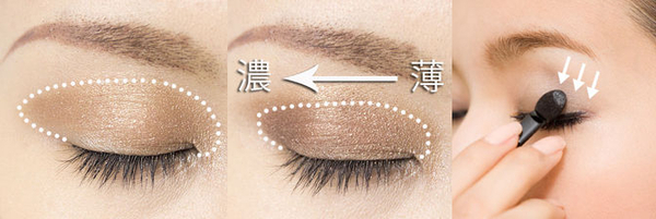 如圖,先打一層薄的在全眼窩上,接著用深色眼影做裡到外的漸層