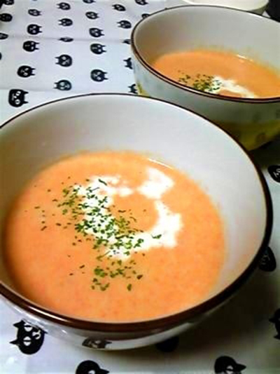 所以大家也可以煮成紅蘿蔔濃湯,像這樣的濃湯不僅有美白成分,看起來也很好吃呢!