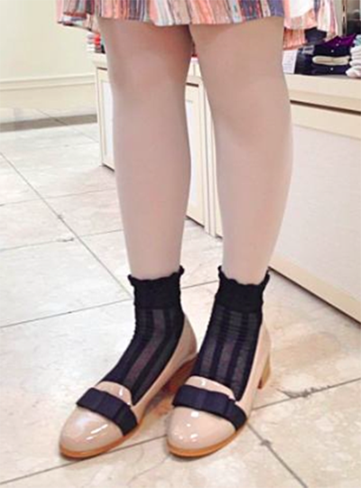 像這樣的半長襪就會建議大家選擇「娃娃鞋」或是「高跟鞋」來搭配