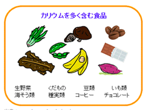 海帶、裙帶菜、花蛤、西瓜、香瓜、香蕉、奇異果、黒糖、蒟蒻、綠黃色野菜、豆類等。