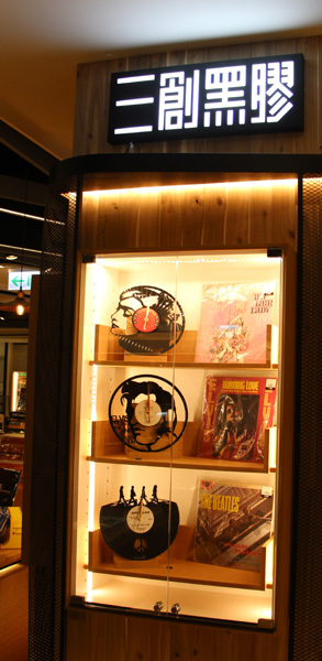 燈箱內左邊所展示的黑膠時鐘,頗富創意