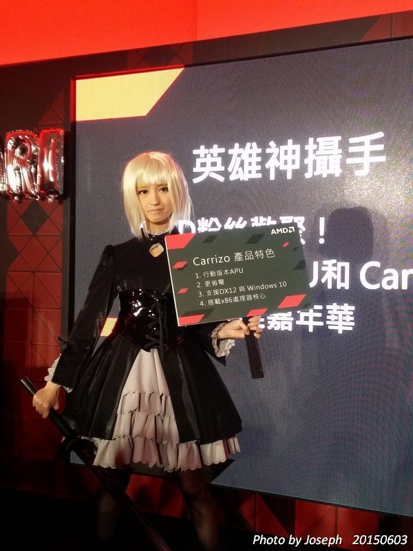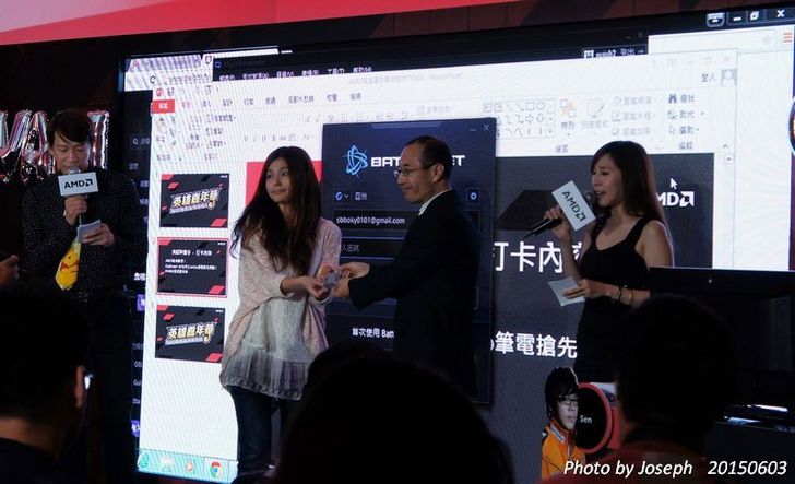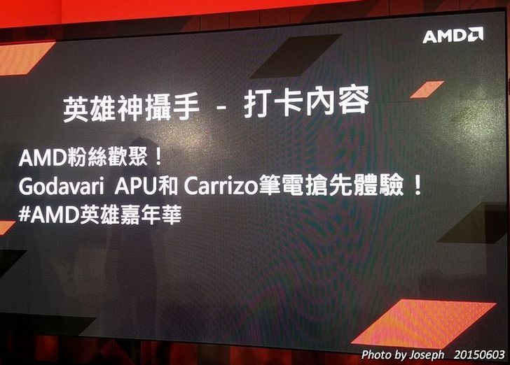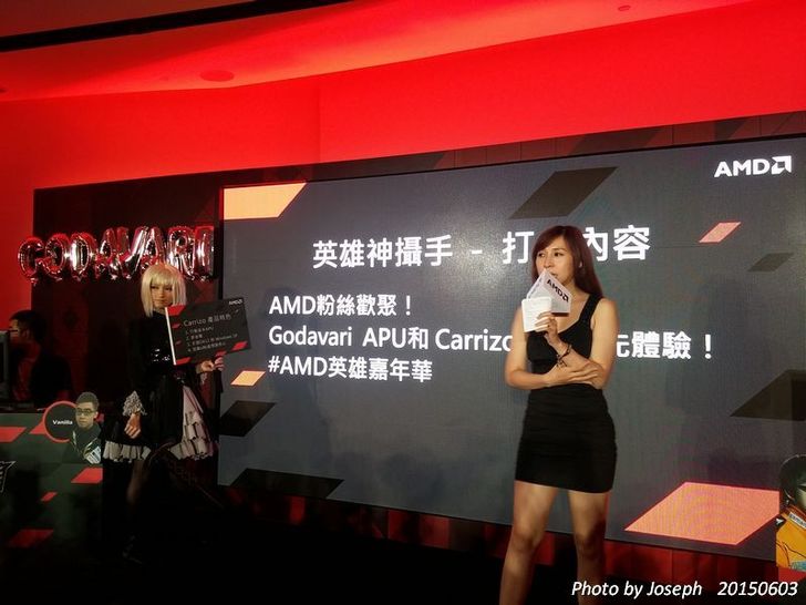 而且在第一場PK賽結束後,則是中場休息的時間抽獎時段,這段時間是"英雄神攝手"活動,也就是由SG --小漾漾來拿手板告訴我們Carrizo產品特色,再來則是由大家來進行有獎徵答,而現場參與的人員,只要在Facebook貼上有AMD產品的照片,並且加"AMD粉絲歡聚! Godavari APU和Carrizo 筆電搶先體驗! #AMD英雄嘉年華"