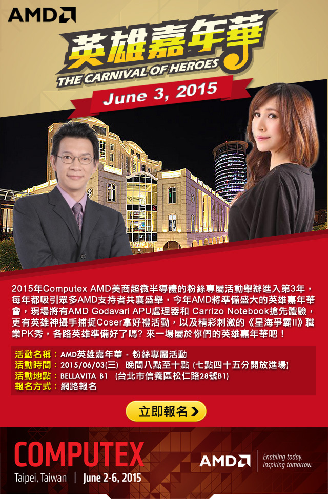 又到了一年一度的Computex Taipei ,除了有機會看到各大廠最新的產品之外,另外最為期待的就是AMD所舉辦的英雄嘉年華了,去年很幸運的入選到名額之中 ,所以今年一樣也是很希望自已能夠中籤,結果很幸運的在上星期被通知到了又再次的入選,所以抱著開心的心情且如期的來到了會場