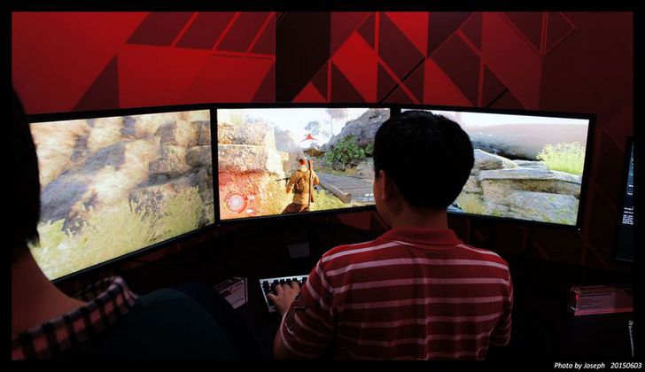 連接三個螢幕玩Sinper Elite3 ,這款還未發表的AMD 顯示卡,展示AMD FreeSync 與 Eyefinity技術, 玩起來效能真好,很順暢不會有延遲的現象發生