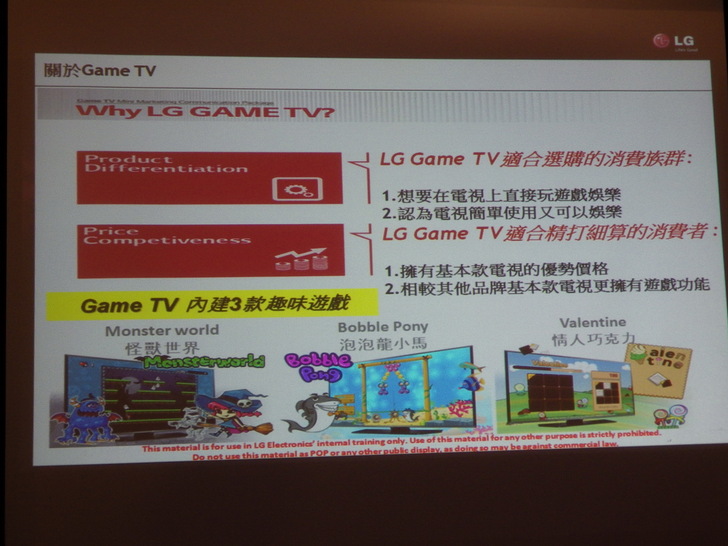 而為了增加電視的娛樂性,LG也出了一款簡易又有娛樂性的電視,內建三種遊戲,可以讓消費者在無聊之時,玩玩遊戲打發時間