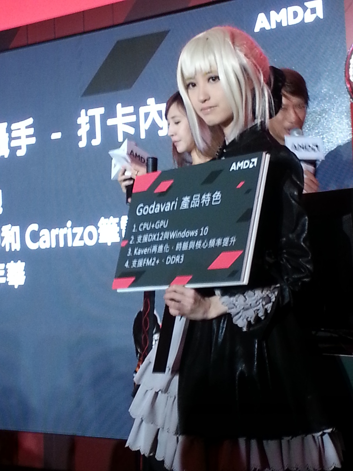中間也穿插了Cosplay秀,由這次參與活動的AMD迷COS自己喜歡的角色,讓台下的其他人以歡呼聲決定誰是贏家,最後是由一位扮驗女僕的女生獲得第一名,得到最好的獎品,其餘第二第三名的獎品都一樣,只是為了炒熱氣氛而已。在英雄神攝手的活動也進行了有獎問答的活動,分別是Godavari CPU和 Carrizo APU的相關問題,由Coser拿著板子,上面有著Godavari CPU和 Carrizo APU的介紹,而答案就是與板子上面一模一樣。
