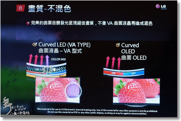 ▲OLED第三特色就是不混色;以目前幾家推出曲面電視的廠商,只有 LG是採用OLED,螢幕色彩呈現往前投射狀況下,因曲面會造成交錯的情況,就會造成混色,而OLED因自體發光,所以不混色。