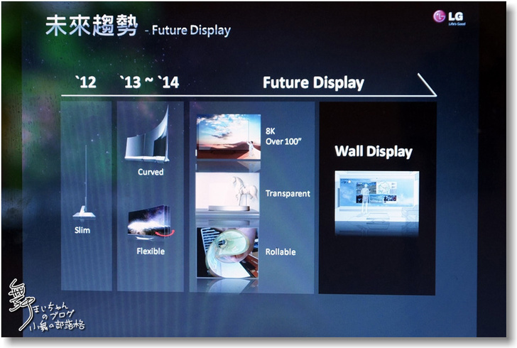 ▲而液晶電視的趨勢也可從這張表看出來,2012年電視強調超薄;到了2013~14則張調曲面電視;接著未來的趨勢除了會往更高解析度與、可透視與可彎曲電視,再更則是牆面電視,把日常生活所需都投射到牆上