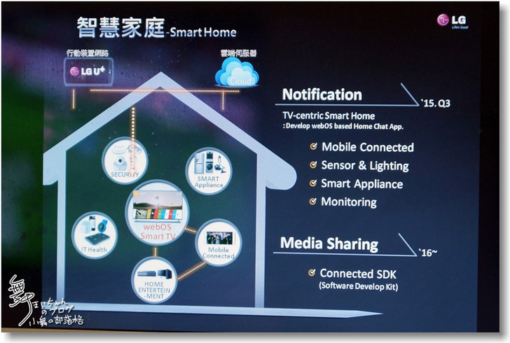 ▲而LG電視也強調智慧家庭的概念,讓電視能與手機或平板等行動裝置進行連結,未來將會更擴大與網路間的運用,畢竟電視是家廳中最大的顯示螢幕,所以跟家中各項裝置結合,成為智慧家庭的中心。