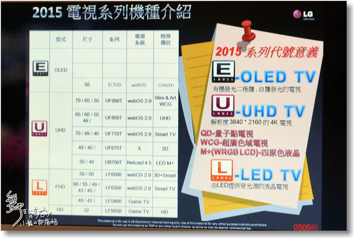 ▲接著回到LG產品,首先介紹的是LG的電視型號如何區分;主要以『E、U、L』3個系列來分類;E Label為OLED TV;U Label為4K UHD TV;另外L Label是LED TV。而高低階區分比較簡單,型號數字愈大愈高階。
