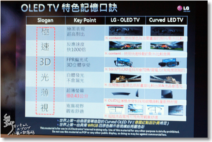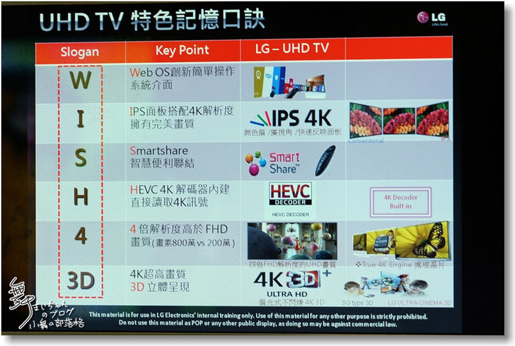 ▲所以小結以上LG UHD TV的特色,同樣也有一個口訣:W、I、S、H、4、3D