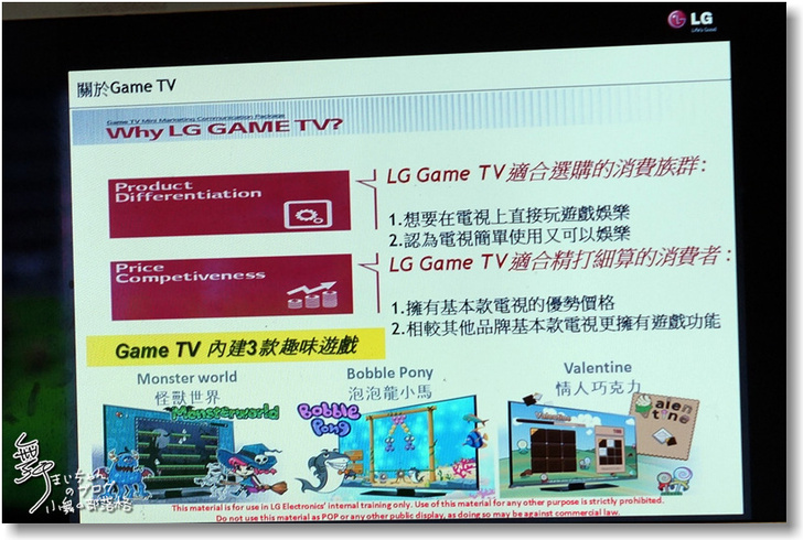 ▲最後則是Game TV系列,就算是LG最基本款的電視,雖然沒有太多高階功能,但仍有一些與眾不同的特色:提供了IPS面板、全機保固3年、內建3款趣味遊戲,讓基本款電視也比他牌更俱優勢。