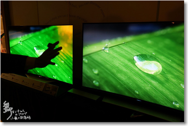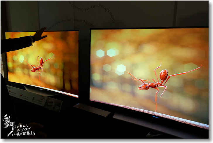▲只好高舉雙手透過相機來看看發生什麼事,原來是LG Super UHD TV的比較,左邊是旗艦款65UF950T,右邊是55UF850T,,兩款都俱備極真實的色彩,但65UF950T俱備有廣色域的ColorPrime,還是略勝一籌。