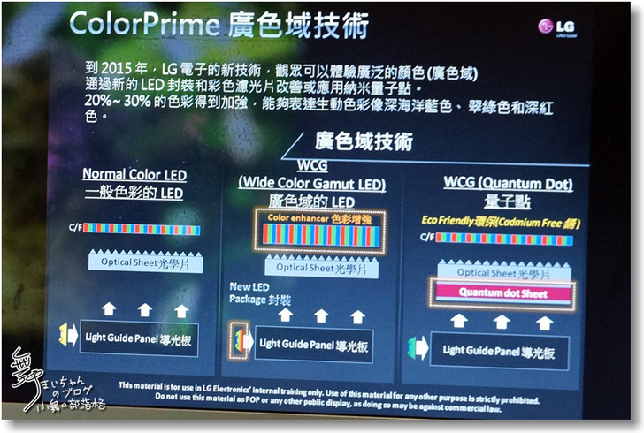 ▲這時更進一步說明LG的廣色域技術,透過更大的彩色濾片來提昇20%的色彩,另外Quantum Dot量子點是透過增加一片量子點薄膜來整體提昇畫質。