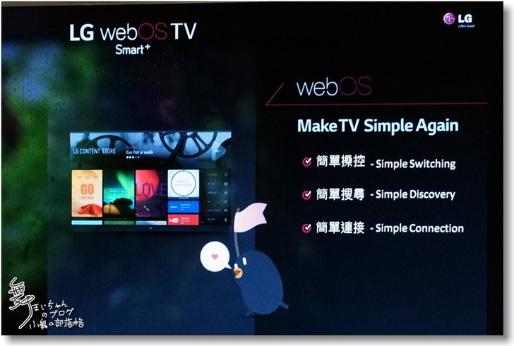 ▲LG的Web OS系統是希望簡化現有Smart電視在操作上的複雜,透過Web OS的三大特點:簡單操控、簡單搜尋、簡單連接,讓智慧電視更簡單。