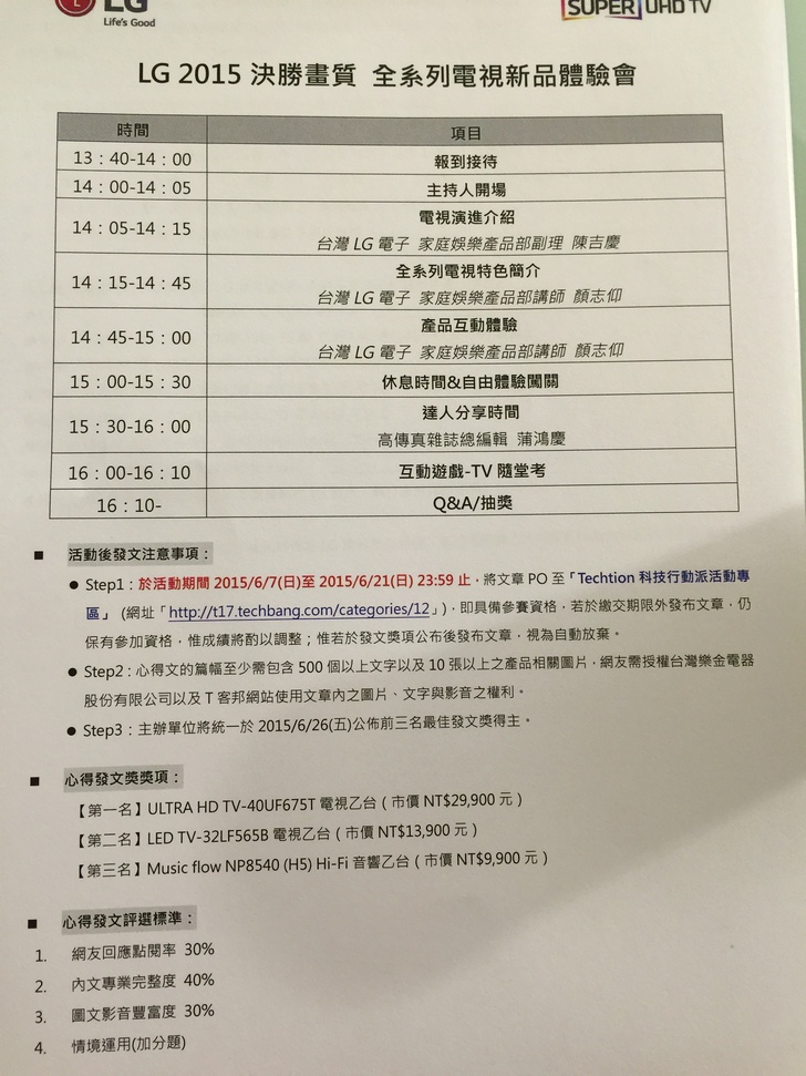首先感謝LG新品團隊給我這個機會,讓我可能了解LG新品的內容和電視相關資訊,這是我第一次參加電視的體驗會,我覺得還滿新鮮,不過一到現場就有點後悔了,發現大家都好像是專業的部落客,感覺我今天應該又不小心跑錯場地了~~所以我只好又帶來一場不專業的發文,希望大家能多多包涵囉~~!!!