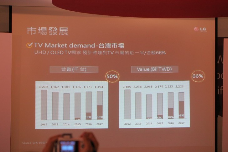 在台灣市場發展方面,預計UHD/OLED TV需求將達到TV市場的近一半/金額66%。