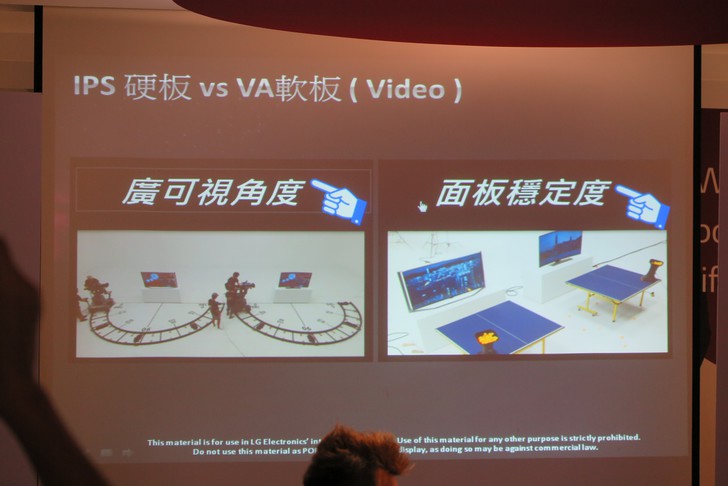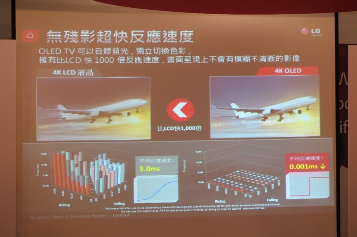 由於LG採用OLED,可以自體發光,獨立切換色彩,擁有比LCD快1000倍反應速度,所以畫面上不會有模糊不清晰的影像。