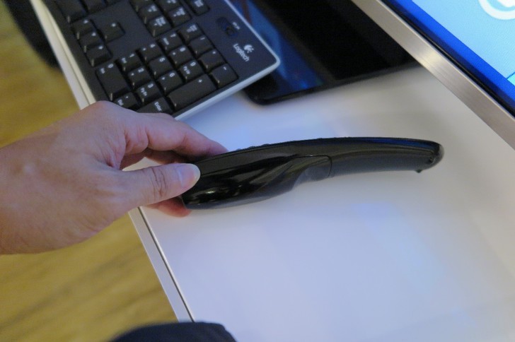 相對的,就做個對比,後來在今年年中後,我家有第2臺電視,它的遙控器就不一樣了,它有滑鼠的功能,怎麼做呢?就是將遙控器放在桌面上,就會變滑鼠功能,它也有語音輸入。