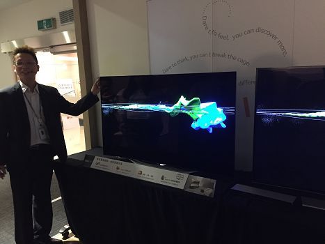 OLED超薄電視,真的很薄,後來有個神祕人拿50元來給我做比較。