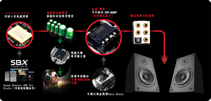 在音響產品領域中,電容這種電子零件最容易影響到音質好壞;而這片主機板採用知名的Nichicon 高階音效處理電容,音質表現有一定水準。加上產品搭配了全球最高速的四核心Creative Sound Core3D 音效處理器,及Creative SBX PROSTUDIO音效軟體套件,看電影或玩Game時的音效爽度絕對高到破錶!最後要提的一項特色是,這片主機板內建4個採”USB DAC-Up”設計的USB 2.0連接埠,可有效為DAC提供更純淨、無雜訊的電源供應環境;這對手上有多種高階USB DAC的玩家來說,無非是一大福音啊!在下期的單元中,我們會做更進一步的產品其它功能特色介紹,敬請期待!
