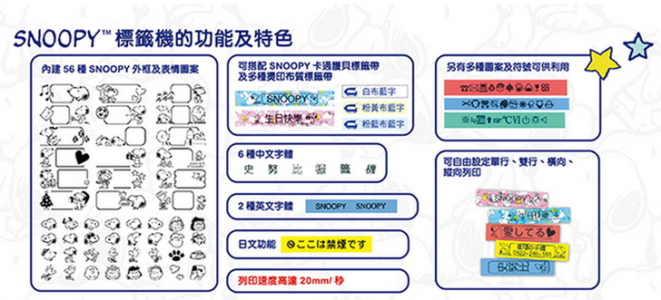 ▲ SNNOPY標籤機的創意特色,也不可小看,除了56種專屬外框與圖案外,字型、排列等也可發揮創意