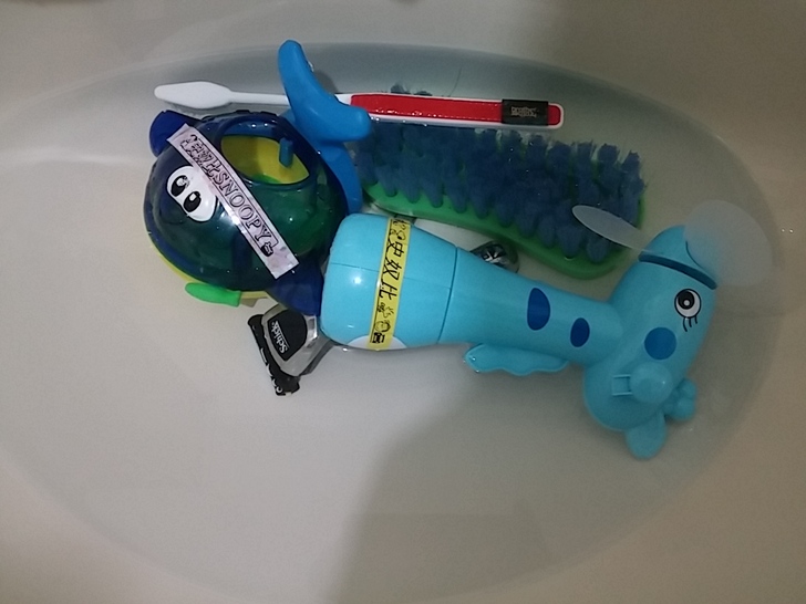 ▲ SNOOPY:為什麼把我貼在這此衛浴產品上?因為,這些產品最不規則性,且在潮濕環鏡,測試防水,加上它們都有毛,可以測一下是否耐磨。把它們全放進水中,並用大刷、小刷,用力互刷,看會有什麼結果