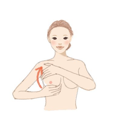 2. 將左手食指到無名指,三指的指腹由右胸下方,沿著胸緣經過兩胸間往上推壓