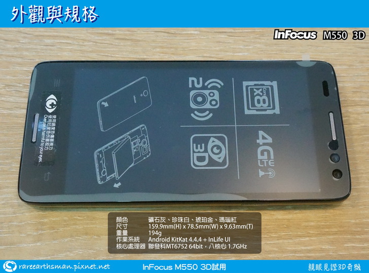 ▲在彩盒內的M550 3D螢幕上用保護貼保護著,保護貼上印著這支手機的4大強項,8核心/4G/雙喇叭/3D螢幕。M550 3D的前面板設計都相同,不同的是搭配了不同的背蓋,原廠出了礦石灰、珍珠白、琥珀金、瑪瑙紅這4款顏色背蓋,就官網上的圖庫看起來只有珍珠白的背蓋是使用斜格紋的表面處理,其餘3種顏色都是使用類髮絲表面處理,各顏色實際情形就有賴其他網友分享了。其他資訊包括外型尺寸是159.9mm(H)x78.5mm(W)x9.63mm(T),經過實際量測後,官網尺寸是標注手機本體尺寸,但是寬度最大尺寸是電源鍵到音量鍵,厚度最大尺寸是主相機,所以量測後的尺寸是159.9x79.1x10.4mm。規格重量194克,我有裝上電池,一張SIM卡,一張記憶卡,實測重量是197克。另外使用Android4.4.4的系統與InLife UI;內建聯發科MT6752 64bit,八核心 1.7GHz。