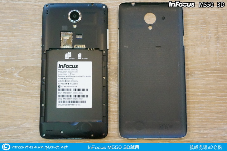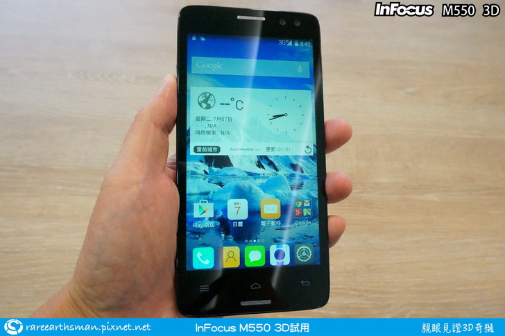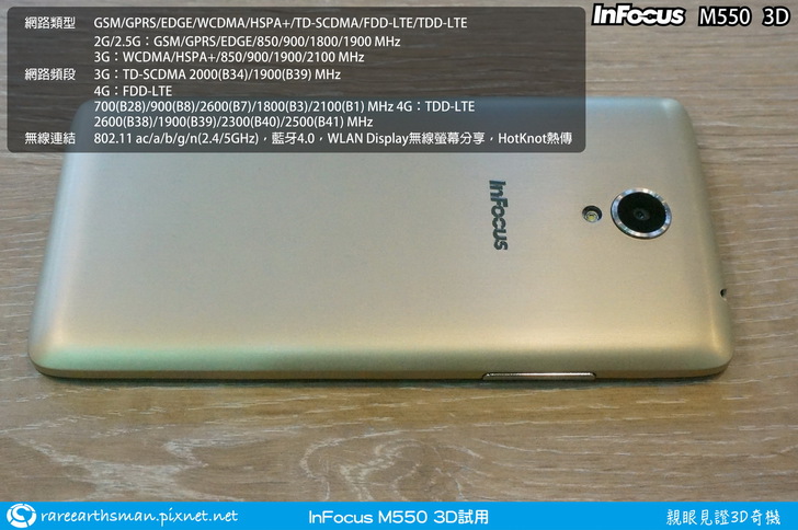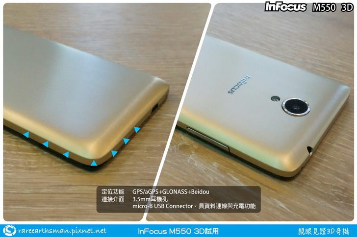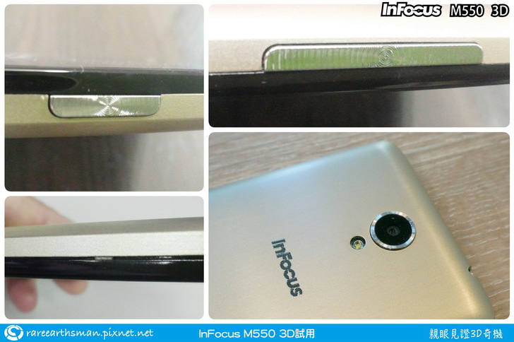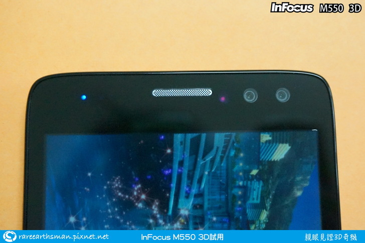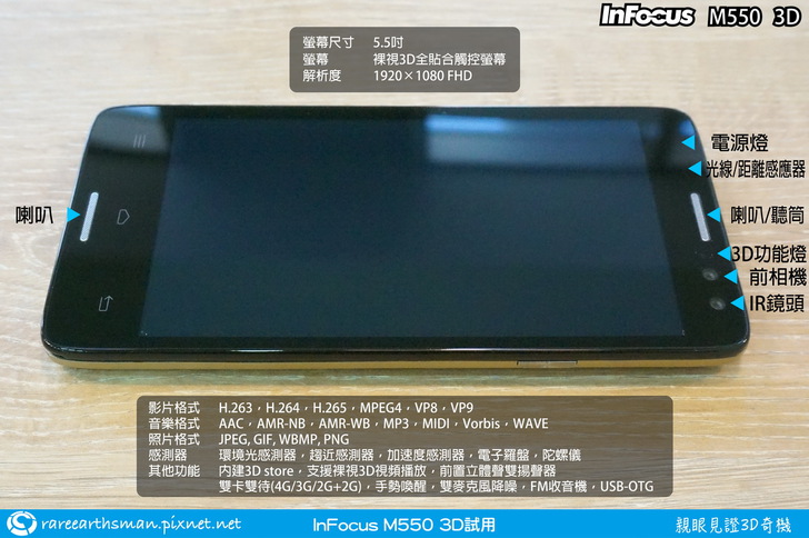 ▲M550 3D使用了5.5吋裸視3D的螢幕,解析度是1920×1080 FHD,其餘是照片與音樂支援的格式、感應器與其餘功能。M550 3D的正面並沒有放上Infocus的Logo,再加上對稱性的設計,所以有時手機拿起來時會不小心拿反了。