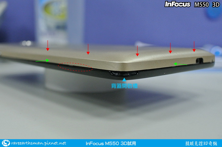 ▲要說明一下我試用這支手機上的一個缺點,前面有提到背蓋設計的很簡單,基本上是將背蓋對齊手機後方後然後四邊壓壓壓就能組裝好,如圖要施壓紅色箭頭的力量,可是偏偏會有好幾個背蓋的卡溝不容易卡進去,所以就需要個別針對沒卡進去的卡溝從水平方向(如綠色箭頭方向)把卡溝給壓進去,但是四邊都壓好後,發現蓋板開啟處旁邊的一個卡溝怎麼壓都卡不進去,所以外觀就留下一個小縫,這件缺點就不曉得是個案還是通病,也要等其他網友看看是不是也有這種情形發生;而且一提,其實我是覺得要拆被蓋有點小不容易,一定要一個一個拆卡溝,主要因為你可以感覺到背蓋很軟,怕太用力壞傷到它,所以只能慢慢拆,相反的組裝上去也是要沿著邊緣壓壓壓,老實說,沒有很順,這僅只我適用上的個人感覺。