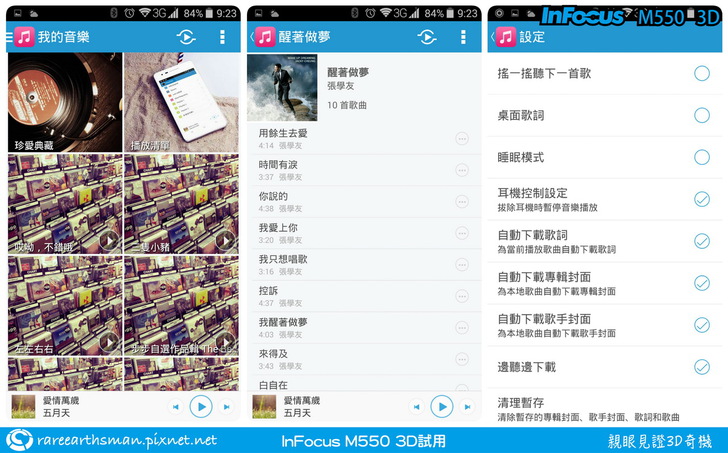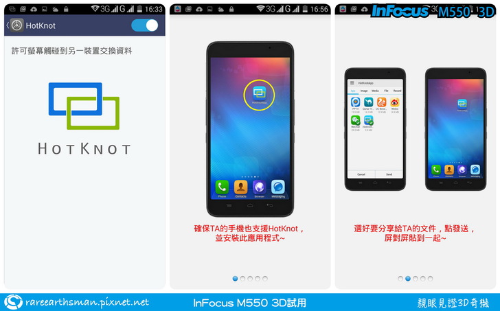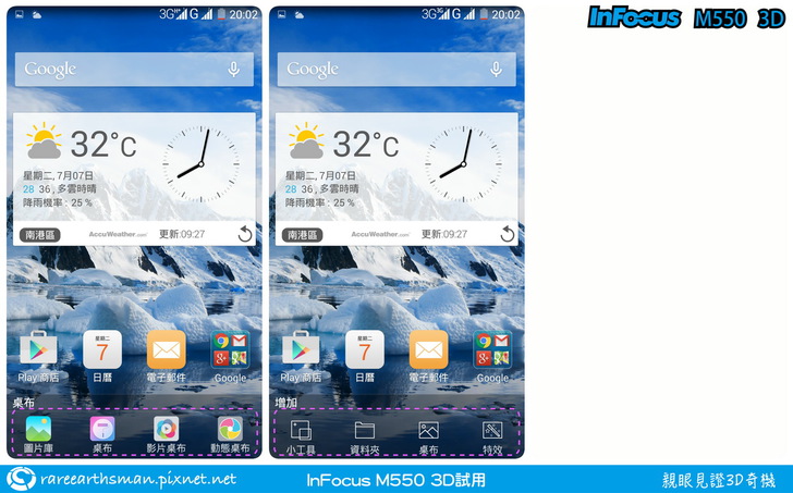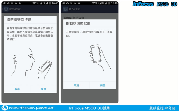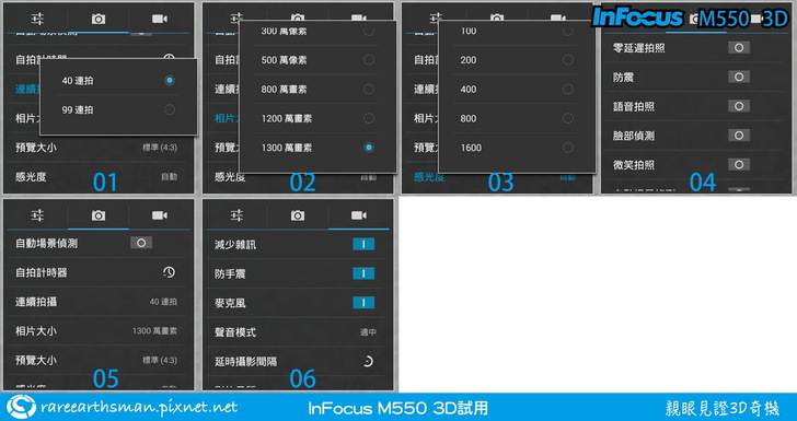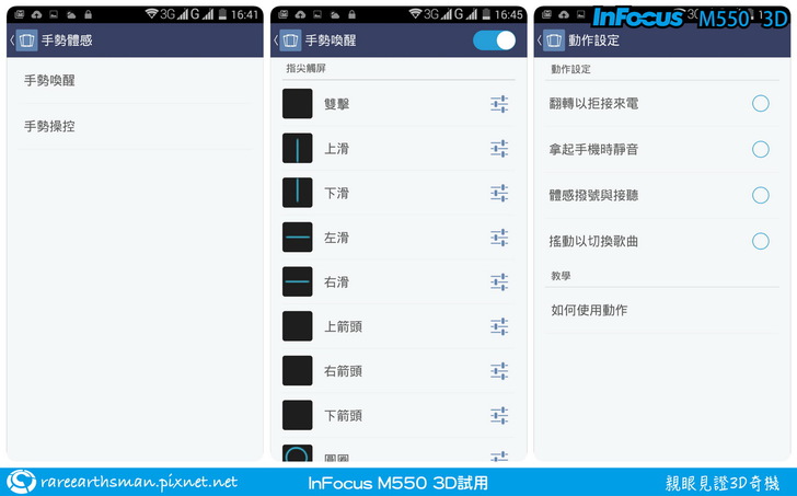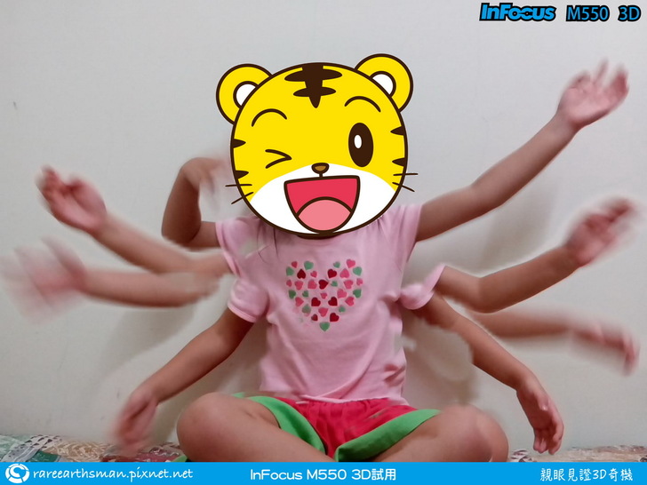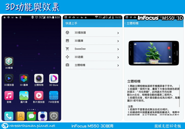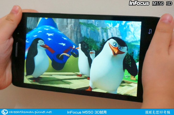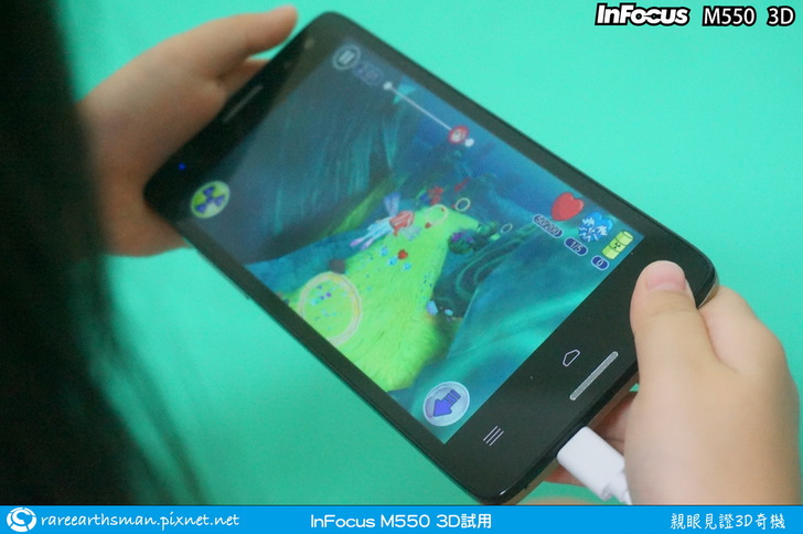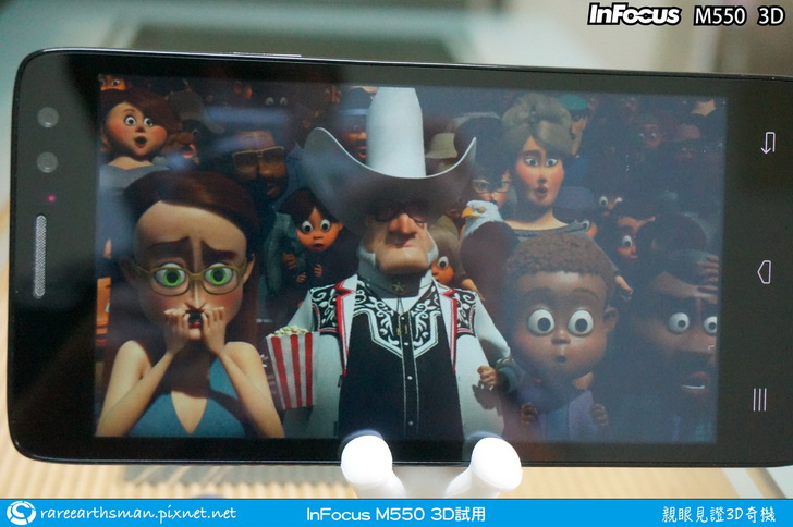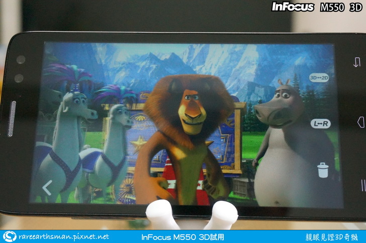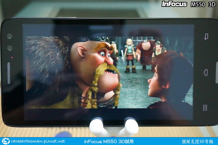 因為M550 3D主打的是裸視3D功能,所以一拿到手機最先體驗的就是3D功能,感覺起來立體效果還算滿意,一剛開始的磨合時間很短,其實很快就上手了,眼睛很快就抓到是當的距離與放多少的焦距?對哪個焦點?可以說一下子就可以抓到這個感覺,立體感很不錯,感覺背景依距離感被吸入螢幕裡面,產生了視差的立體3D效果。