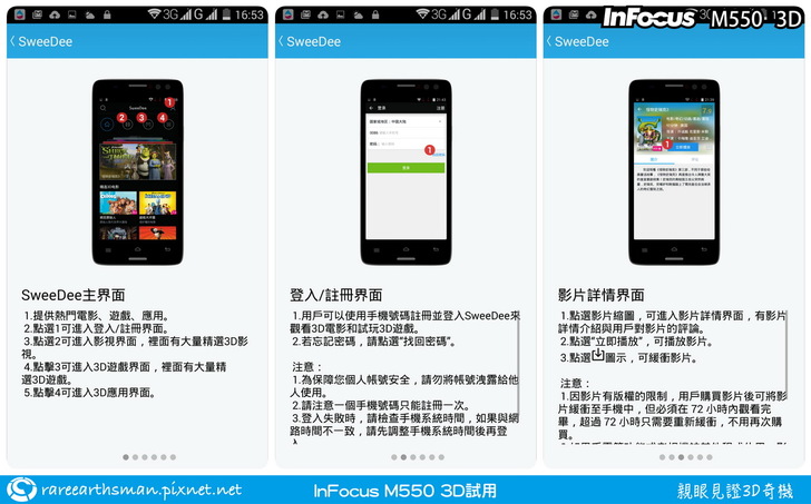 ▲M550 3D主打的是它的3D裸視功能,自然就有一些預設的3D相關APP;我們可以在M550 3D裡面先找一下3D響導這個APP,它只是一個介紹形式的軟體;進入APP之後就會出現這支手機裡面相關3D的其他APP列表,簡單的就是一個介紹各項3D功能與如何操作的軟體,預設在這支手機的3D APP共有3D播放器/3D圖庫/SweeDee/3D遊戲/立體相機這幾個APP。