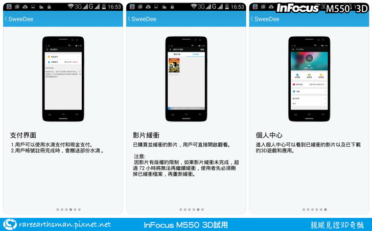 ▲透過SweeDee觀看3D影片,影片的3D效果還不錯,剛開始看時還需要試一下觀看距離,但是看一下子其實很快就會融入到整個3D效果裡面,雖然不像電影院中的立體電影,物體會跑到眼前與身邊這麼逼真,但是以手機的裸視播放來說已經很有立體感了。