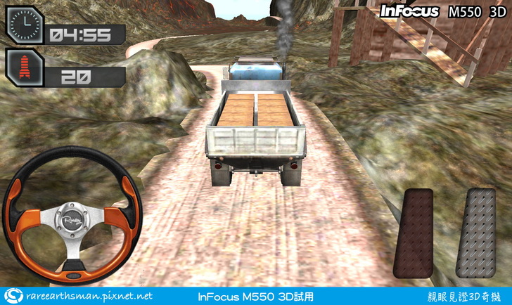 ▲透過SweeDee下載的3D泥土卡車,使用3D效果來開卡車,老實說,遊戲的慧根很重要,沒有慧根,怎麼開都撞山,不然就是掉到邊坡翻車,3D的效果使平面的駕車遊戲更有前後的立體感了。