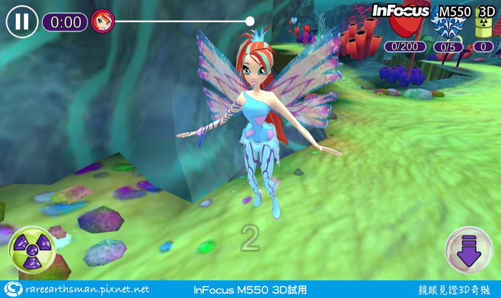 ▲透過SweeDee下載的3D海底探險遊戲,它的3D感比3D泥土卡車來的更強烈,加上它是可以好幾個方向的移動,就操控上更為自由,但是以小朋友來說就很難去控制了,但是如果喜歡玩這類立體空間飛行遊戲來說,3D效果增加了深度的立體感,算是另一種飛行模式吧。