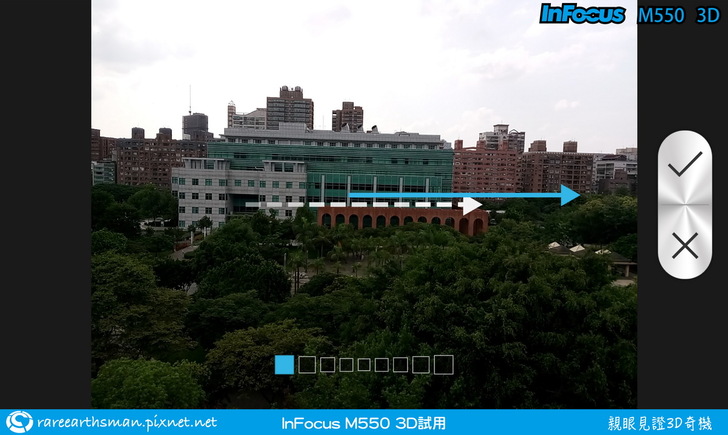 ▲Infocus所使用的全景模式其實滿簡單也很容易成功,簡單來說就是移動手機將白色箭頭虛線移動到藍色箭頭,一步一步按照手機指示操作就OK,拍照中途決定OK了就可以直接按打勾鍵就完成全景拍照,或者是全部移動完9個箭頭,系統就會自動完成拍照,而最多可以拍攝約270度的全景。